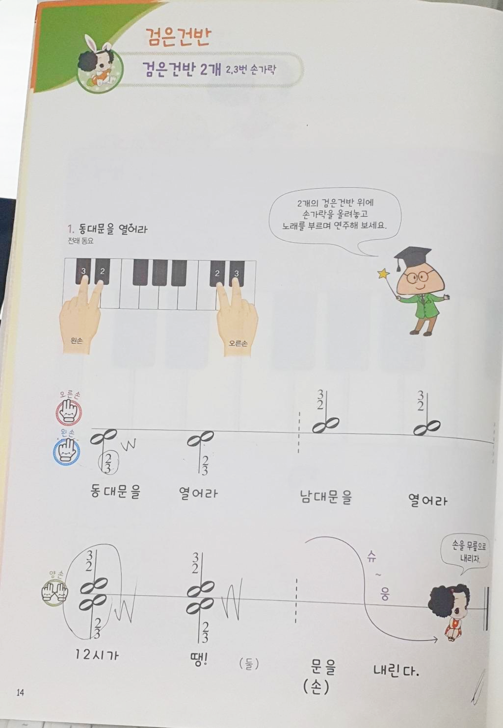 7번 <개구리와 코끼리>입니다. 왼손은 검은건반 3개, 오른손은 검은건반 2개에 올립니다. 책에 나와있는 손 자리 그림을 보면 쉽게 찾을 수 있습니다. 이 곡은 첫 번째, 두 번째 마디의 2번 손가락을 연주하는 부분에서 기둥이 내려간 음은 왼손, 기둥이 올 리간 음은 오른손으로 구분하여 연주해야 합니다. 같은 손가락 번호라서 한 손으로 칠 수 있기 때문에 기둥의 방향에 따라 손이 다르다는 것을 강조해주어야 합니다.