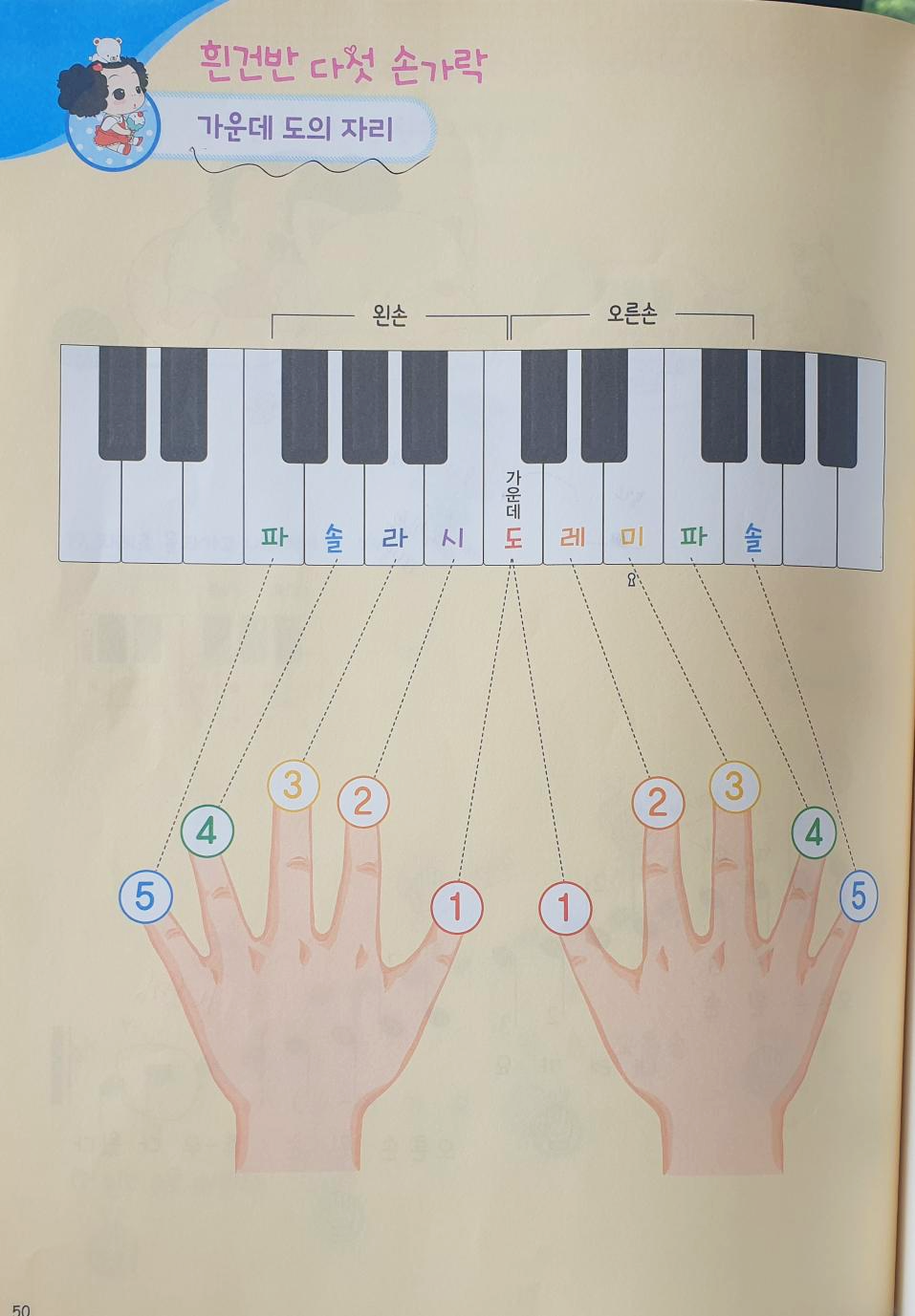 20번 <즐거운 노래>입니다. 이 곡은 가운데 도의 자리에서 연주합니다. 가운데 도는 피아노 건반에서 가장 가운데에 위치한 '도'입니다. 찾는 방법은 매우 쉽습니다. 양손의 1번 손가락을 펴서 모두 가운데 도로 모으고 나머지 손가락들을 펼쳐주면 됩니다. 아이들을 가르칠 때는 "양손 1번 손가락 (아빠 손가락) '가운데 도'로 모여라!"라고 가르치면 쉽게 찾습니다. 가운데 도의 자리를 찾았다면 오른손부터 차례대로 음이름을 말하며 건반을 눌러봅시다. 오른손은 1번(도), 2번(레), 3번(미), 4번(파), 5번(솔)입니다. 오른손은 도레미파솔 차례대로 가기 때문에 쉽습니다. 이번에는 왼손입니다. 왼손의 계이름이 조금 생소할 수 있습니다. 왼손의 손가락 번호 1,2,3,4,5번을 차례대로 연주하면 왼쪽 방향으로 내려가기 때문에 음이름이 거꾸로 내려가게 됩니다. 따라서 1번(도), 2번(시), 3번(라), 4번(솔), 5번(파)이 됩니다. '도시라솔파' 거꾸로 내려가는 음이름을 정확하게 인지해야 합니다. 가운데 도의 자리를 정확하게 이해했다면 곡을 연습합니다. 처음에는 손가락 번호를 읽으며 연습하고 다음은 음이름을 말하면서 연습해봅니다.